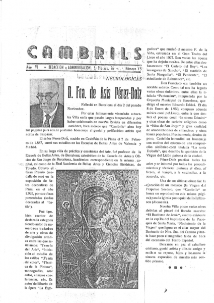 En noviembre de 1987, con motivo del centenario de su nacimiento, se presenta en Cambrils una exposición de su obra, con 65 obras pictóricas, ilustraciones, obras musicales, etc., promovida por José Salceda i Castells, historiador y cronista de Cambrils, con la colaboración de Carmen Pérez-Dolz, una de las hijas de F. Pérez-Dolz.